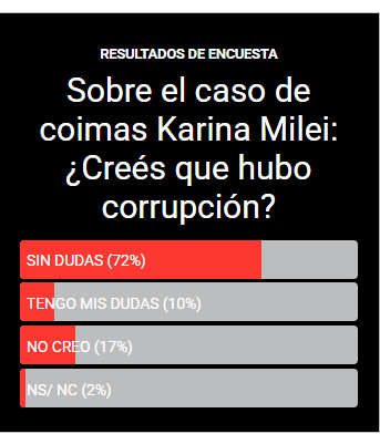 La categoría "Sin dudas" arrasó con el 72% de las respuestas, dejando en evidencia que la mayor parte de los encuestados no tiene fisuras en su juicio sobre el asunto. Se trata de una cifra abrumadora que marca una tendencia clara en el clima social respecto a este caso que ha sacudido al gobierno.