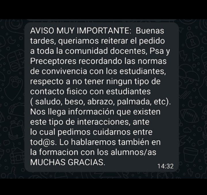La drástica disposición quedó plasmada en un comunicado interno enviado a toda la comunidad educativa: "Buenas tardes, queríamos reiterar el pedido a toda la comunidad docentes, Psa y Preceptores recordando las normas de convivencia con los estudiantes, respeto a no tener ningún tipo de contacto físico con estudiantes (saludo, beso, abrazo, palmada, etc). Nos llega información que existen este tipo de interacciones, ante lo cual pedimos cuidarnos entre tod@s. Lo hablaremos también en la formación con los alumnos/as MUCHAS GRACIAS".