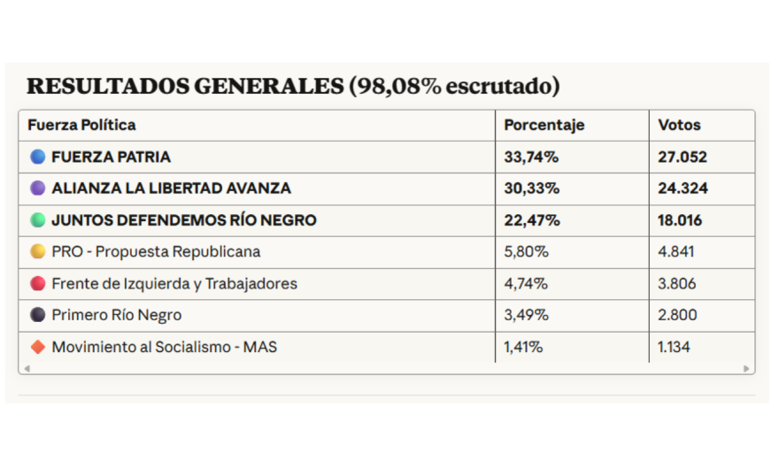 Fuerza Patria ganó con el 33,74% (27.052 votos). La Libertad Avanza sacó 30,33% (24.324 votos). Juntos Defendemos Río Negro quedó tercero con 22,47% (18.016 votos). Tercero en su propia casa, tercero después de haber sido el poder durante décadas, tercero mientras las dos fuerzas que lo desplazaron suman entre ambas más del 64% de los votos. No es un detalle, es una declaración.