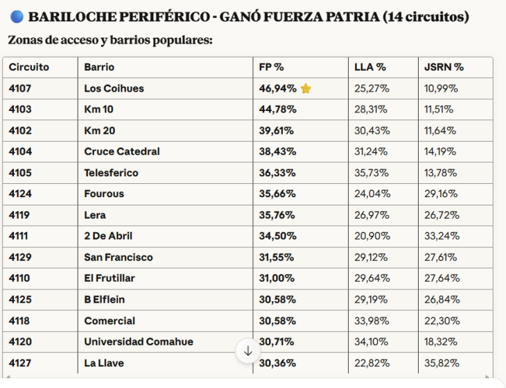 En los 14 circuitos de la periferia y los barrios populares, Fuerza Patria dominó con un promedio cercano al 35%, mientras La Libertad Avanza apenas rozó el 28% y Juntos quedó relegado al 20%. Los Coihues, por ejemplo. 46,94% para Fuerza Patria. Es el barrio donde más votó el kirchnerismo en toda la ciudad, y no es casual. Los Coihues está en el margen, en el borde, en esa zona donde Bariloche empieza a ser otra cosa o deja de ser Bariloche según quién defina qué es Bariloche. Ahí ganó el peronismo con amplitud, con una ventaja de más de veinte puntos sobre La Libertad Avanza. Lo mismo pasó en el Km 10, en el Km 20, en Cruce Catedral, en todos esos lugares que llevan nombres de distancias o referencias geográficasmque lo muestran lejos del centro. Ahí, en los márgenes, Fuerza Patria arrasó.