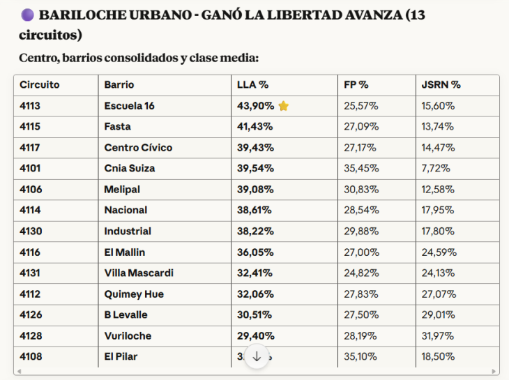 Y después está el centro. En los 13 circuitos céntricos y de clase media, La Libertad Avanza promedió 36%, Fuerza Patria quedó en 28% y Juntos apenas alcanzó el 20%. El microcentro, Escuela 16, Fasta, Centro Cívico. Ahí ganó La Libertad Avanza, y ganó bien. En Escuela 16 sacó 43,90%, su mejor resultado en toda la ciudad. En Fasta, 41,43%. En el Centro Cívico, casi 40%. Son barrios donde vive la clase media, la clase media profesional, la clase media que trabaja en el Estado o en el turismo o en los comercios del centro, la clase media que tiene obra social y manda a sus hijos a escuelas privadas y se va de vacaciones a la costa o al exterior. Esa clase media que durante años votó al radicalismo provincial ahora votó a Milei. No fue un voto de protesta. La clase media barilochense, la que se piensa a sí misma como moderada y sensata, votó por la propuesta más radical de todas. Fue un voto contra el pasado. Asi de siemple, así de intangible.
