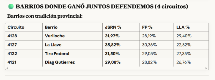 Juntos Defendemos Río Negro, mientras tanto, perdió en todos lados. Perdió en los barrios populares, donde históricamente había tenido arraigo a través de las redes terrotoriales y la presencia del Estado provincial. Perdió en la clase media, donde el radicalismo rionegrino había sido durante décadas la opción natural. Y perdió incluso en esos barrios intermedios donde uno podría haber esperado que el voto provincial resistiera. Solo ganó en 4 circuitos de 31: La Llave (35,82%), Vuriloche (31,97%), Tiro Federal (31,50%) y Diagutierrez (29,08%). Cuatro de treinta y uno. Y aun en esos lugares, los márgenes fueron estrechos, sin épica, sin entusiasmo.