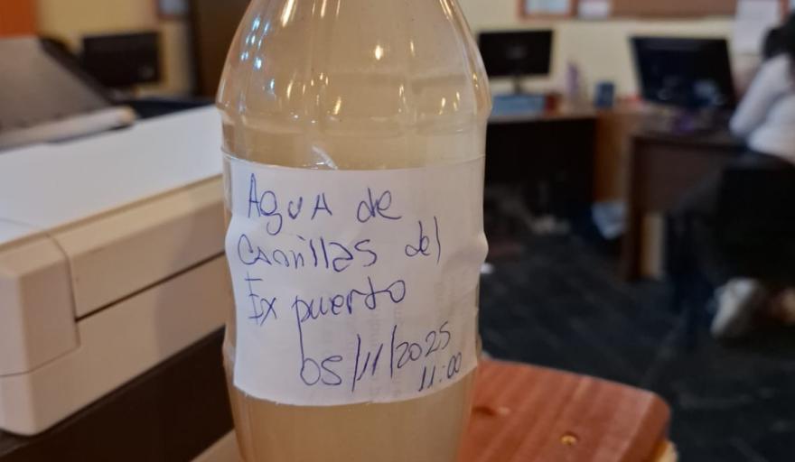Personal del lugar recolectó muestras del agua el pasado 5 de noviembre a las 11:00 horas para su posterior análisis. La botella etiquetada como "Agua de canillas del Ex puerto" evidencia a simple vista la gravedad de la situación: el líquido muestra una coloración amarillenta turbia que contrasta dramáticamente con lo que debería ser agua cristalina.