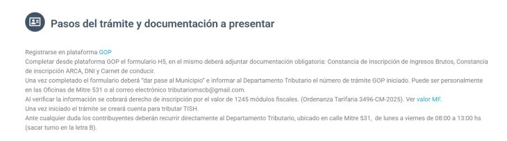 La comunicación oficial que está llegando a los conductores indica que deben registrarse en la plataforma GOP. Una vez completado el trámite, deben informar al Departamento Tributario el número de expediente GOP iniciado, ya sea personalmente en las oficinas de Mitre 531 o por correo electrónico. El derecho de inscripción asciende a 1245 módulos fiscales, que según la Ordenanza Tarifaria 3496-CM-2025 representa un monto de 464.585 pesos, considerando que cada módulo vale actualmente 373 pesos.