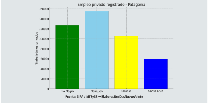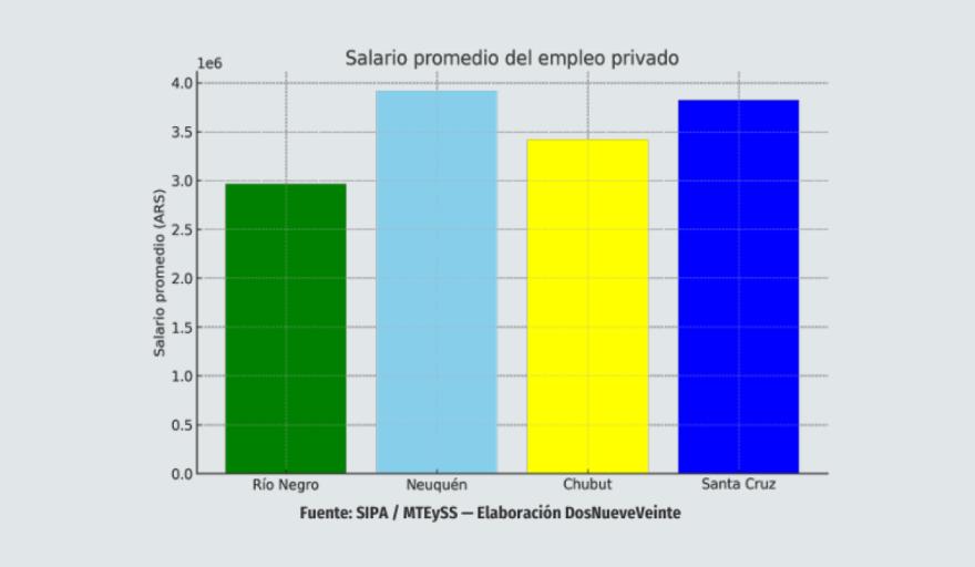 El documento procesa información del Sistema Integrado Previsional Argentino (SIPA) y del Observatorio de Remuneraciones del Sector Privado Registrado, concluyendo que el salario promedio del empleo privado en Río Negro se ubica por debajo de los 3 millones de pesos mensuales, mientras que Neuquén, Santa Cruz y Chubut superan holgadamente los 3,4 millones. La brecha salarial no constituye un dato aislado sino la expresión de un modelo económico que, según el informe, carece de políticas industriales y de agregación de valor.