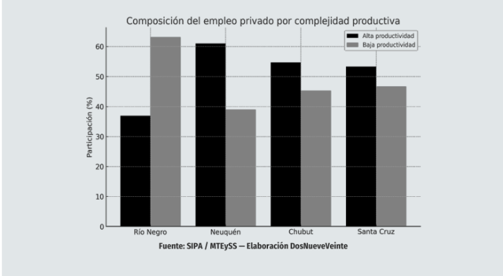 Mientras Neuquén, Chubut y Santa Cruz consolidan economías basadas en hidrocarburos, minería, energía y pesca industrial, Río Negro exhibe una matriz productiva dominada por comercio minorista, turismo estacional, servicios personales y agricultura primaria. El estudio señala que aproximadamente el 63 por ciento del empleo privado provincial se concentra en sectores de baja productividad, mientras que en Neuquén esa proporción se invierte: más del 60 por ciento de los trabajadores se desempeña en actividades de alta complejidad.