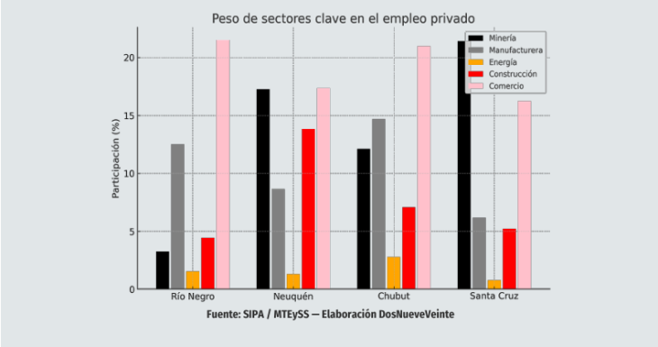 El análisis compara la participación del empleo en sectores clave como minería, industria manufacturera, construcción, energía y comercio. En minería, Río Negro apenas alcanza el 3 por ciento del empleo privado, contra más del 20 por ciento de Santa Cruz y valores superiores en Neuquén y Chubut. En construcción, la provincia también se ubica en el último lugar, mientras que en comercio concentra más de una quinta parte del empleo privado, la proporción más alta de la región.