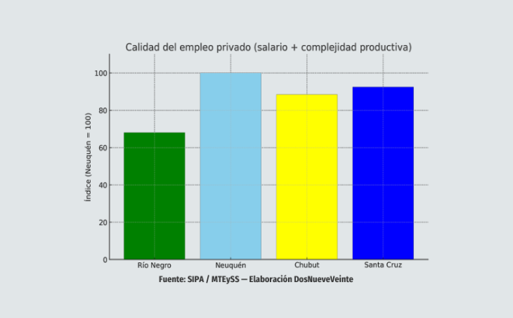 Para sintetizar los hallazgos, el informe construye un índice que combina salario promedio y participación de sectores de alta productividad, normalizando a Neuquén como referencia 100. Bajo este criterio, Río Negro alcanza apenas 70 puntos, más de 30 por debajo del líder regional y con una brecha considerable respecto a Chubut y Santa Cruz.
