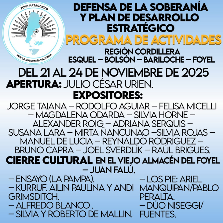 El Foro Patagónico por la Soberanía Nacional es organizado por la agrupación del mismo nombre, que viene trabajando en la articulación de debates en torno a la defensa de los recursos naturales y el desarrollo estratégico de la región. Para mayor información sobre el cronograma completo de actividades, los interesados pueden contactarse con Andrea Galaverna al 2944505014 o con Tomás Guevara al 2944410281.