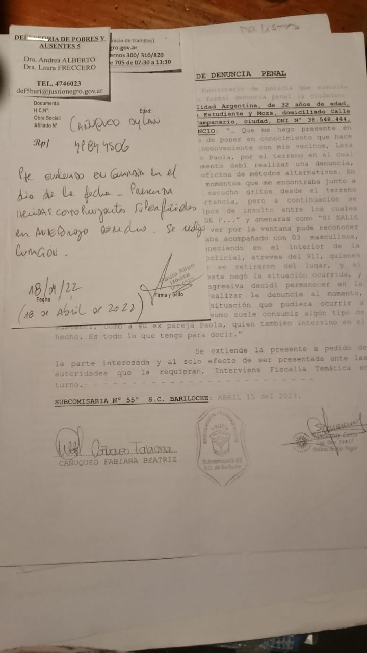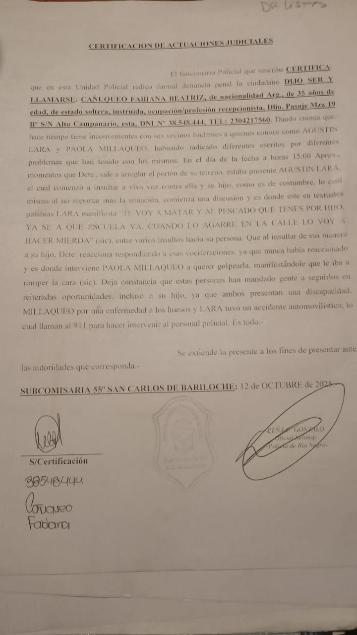 Los documentos judiciales también registran un conflicto previo en abril de 2023, cuando Cañuqueo denunció actos intimidatorios relacionados con el terreno que ocupa. En esa ocasión, describió gritos amenazantes desde una propiedad vecina y manifestó temor por su seguridad y la de su hijo.