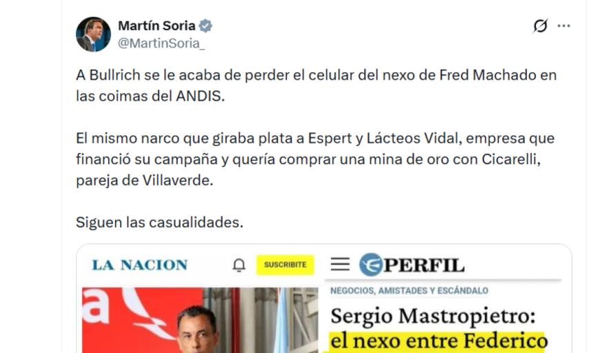 Una publicación en la red social X del exministro de Justicia Martín Soria apunta directamente contra la ministra de Seguridad Patricia Bullrich por la desaparición del celular. "A Bullrich se le acaba de perder el celular del nexo de Fred Machado en las coimas del ANDIS", escribió Soria, quien además trazó conexiones más amplias del caso. Según su denuncia pública, Fred Machado habría girado dinero hacia el economista José Luis Espert y hacia Lácteos Vidal, empresa que financió campañas políticas y estuvo involucrada en negociaciones para adquirir una mina de oro junto a Cicarelli, pareja de Lorena Villaverde.
