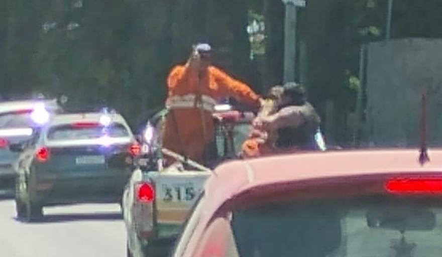La escena fue registrada en pleno tránsito vehicular, con los tres empleados de pie en la caja del vehículo, vestidos con camperas naranjas de alta visibilidad que los identifican como personal municipal. Uno de ellos aparece incluso sosteniéndose de la estructura de la camioneta mientras el vehículo circula por la vía pública.