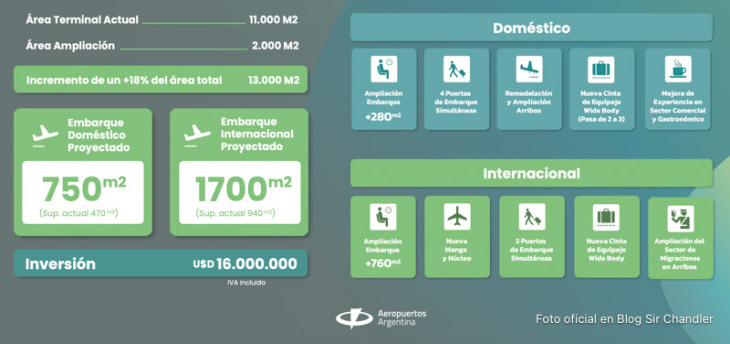 La ampliación contempla 2700 metros cuadrados de superficie de remodelación sobre los 11.000 m² existentes, con mejoras en las áreas de espera, sanitarios y una reconfiguración del espacio en planta baja para optimizar el flujo de pasajeros. El diseño contempla un sistema de embarque flexible que incrementará la cantidad de asientos disponibles y mejorará la oferta comercial y gastronómica.
