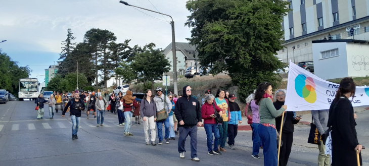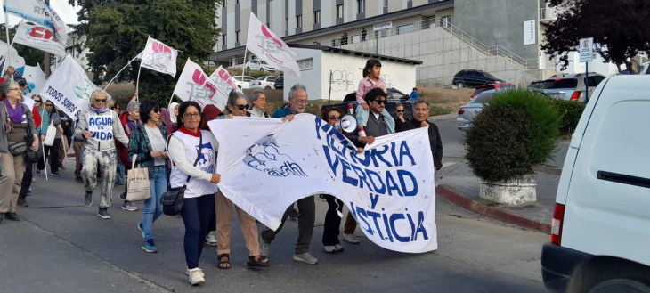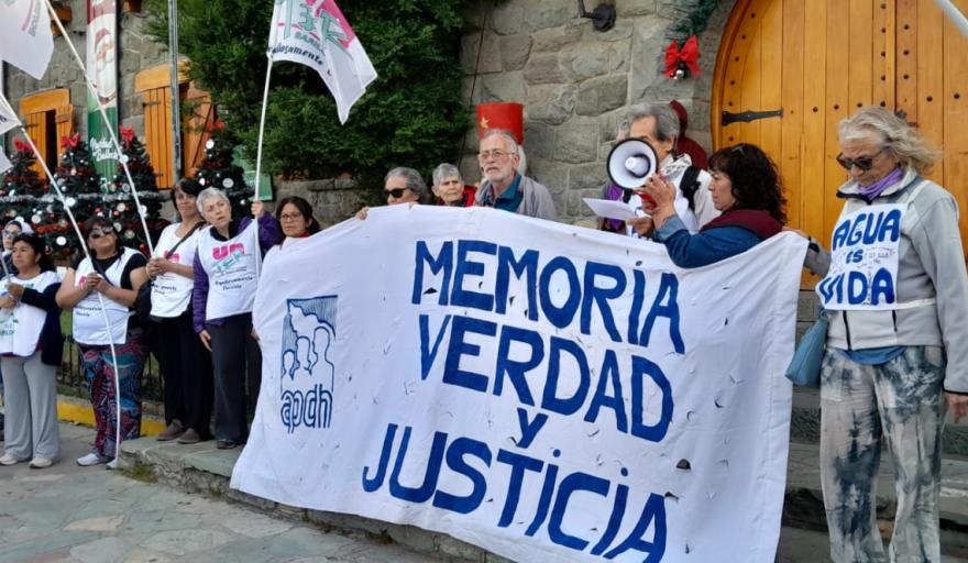 Bajo los pañuelos blancos característicos de la APDH y pancartas que reclamaban "Memoria, Verdad y Justicia", además de la defensa del derecho al agua y otros derechos sociales, la columna marchó por calle Moreno. Durante la movilización, Rubén Marigo, secretario de Violencia Institucional de la APDH Regional Bariloche, fue el encargado de leer el documento firmado por las organizaciones participantes.