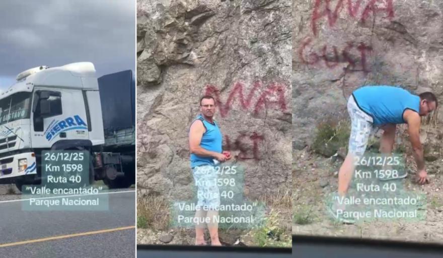Las imágenes muestran al hombre con un aerosol en la mano, pintando sobre las paredes naturales del Valle Encantado, un área de gran valor paisajístico y turístico de la región. "¿Qué hacés hermano? ¿Por qué hacés eso? ¿Por qué estás escribiendo la pared con aerosol, boludo?", se escucha a una persona increpándolo mientras lo filma, evidentemente molesta por el acto de vandalismo.