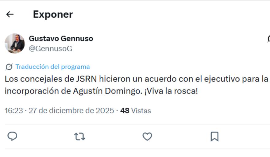 El ex intendente de Bariloche, Gustavo Gennuso, acusó públicamente a los concejales de Juntos Somos Río Negro de haber pactado con el Ejecutivo municipal la incorporación de Agustín Domingo como colaborador del intendente Walter Cortés. "Los concejales de JSRN hicieron un acuerdo con el ejecutivo para la incorporación de Agustín Domingo. ¡Viva la rosca!", escribió Gennuso en la red social X (ex Twitter), dejando entrever la existencia de negociaciones políticas detrás del desembarco del ahora ex diputado nacional al gabinete municipal.