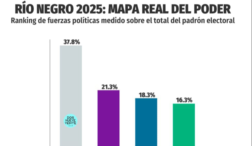 Frente a ese dato masivo, el resto del mapa se achica de manera dramática. La Libertad Avanza aparece como primera fuerza entre los partidos, pero representa apenas a poco más del 21% del padrón total. Fuerza Patria ronda el 18%, mientras que el oficialismo provincial de Alberto Weretilneck queda reducido a un escuálido 16%. El poder se reparte siguiendo las reglas formales de la democracia, pero sobre un suelo social cada vez más angosto. Se gobierna, se legisla, se administra, pero sin multitud que respalde esas acciones con su participación activa en el proceso electoral.