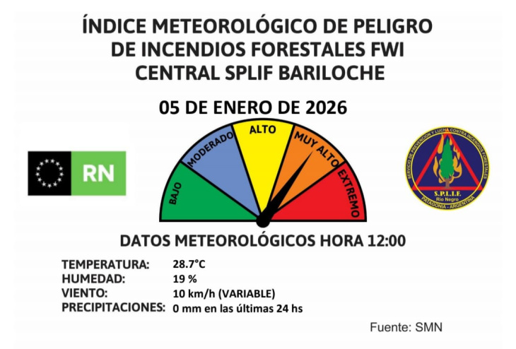 Para este lunes 5 de enero el índice meteorológico de peligro "muy alto" para incendios forestales, según informó el Servicio de Prevención y Lucha contra Incendios Forestales (SPLIF) de Río Negro. El organismo provincial emitió su alerta tras registrar a las 12 del mediodía una temperatura de 28,7 grados, humedad relativa del 19 por ciento y vientos variables de 10 kilómetros por hora, mientras las precipitaciones brillan por su ausencia con cero milímetros acumulados en las últimas 24 horas.
