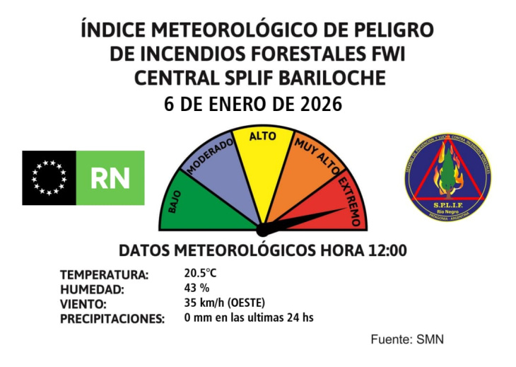El informe diario emitido por el Servicio de Prevención y Lucha contra Incendios Forestales para la zona de Bariloche marcó este 6 de enero el nivel extremo en su escala de riesgo. Los datos meteorológicos registrados al mediodía muestran una temperatura de 20,5 grados centígrados, una humedad relativa del 43 por ciento y vientos del oeste soplando a 35 kilómetros por hora, mientras que las precipitaciones se mantienen en cero milímetros acumulados en las últimas 24 horas.