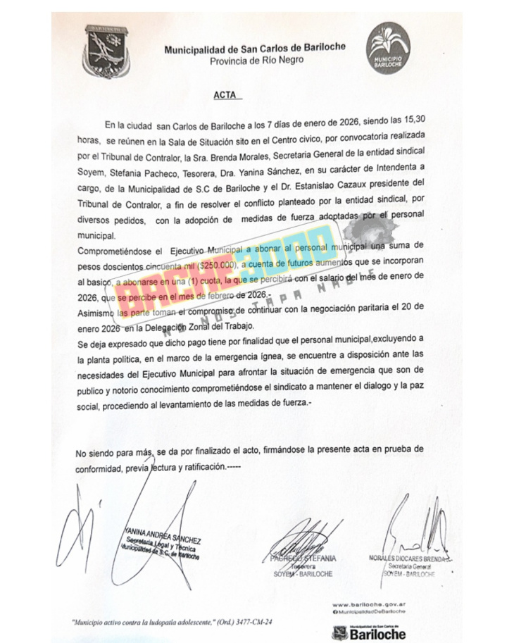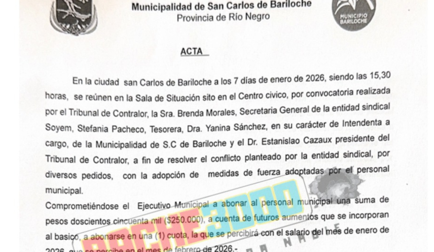 La tregua se alcanzó en el marco de un contexto particular que el acta firmada en el Tribunal de Contralor deja explícitamente registrado. El documento establece que en el pago del bono queda expresamente excluida la planta política municipal.