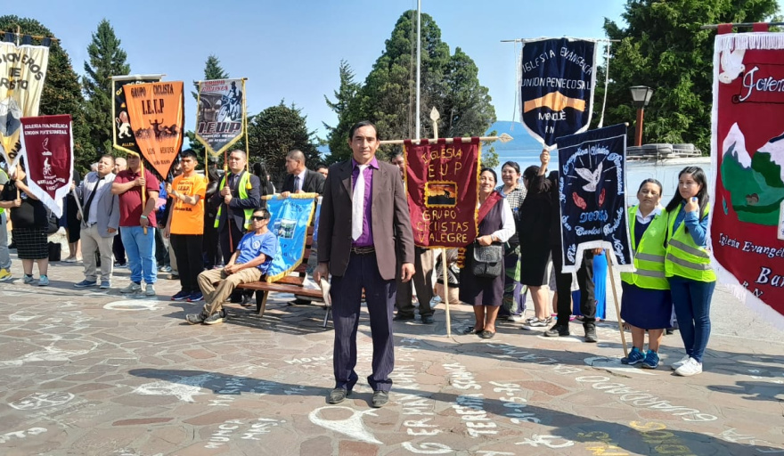 Esta mañana en el Centro Cívico se llevó a cabo una procesión que reunió a miembros de distintas iglesias evangélicas de Bariloche, en el marco de un encuentro que se extiende hasta el próximo sábado con diversas actividades programadas en el gimnasio municipal número 3. El evento congrega a pastores y fieles de una red que se extiende a nivel nacional y alcanza también a Chile y Bolivia, bajo la organización de la Iglesia Evangélica Unión Pentecostal.