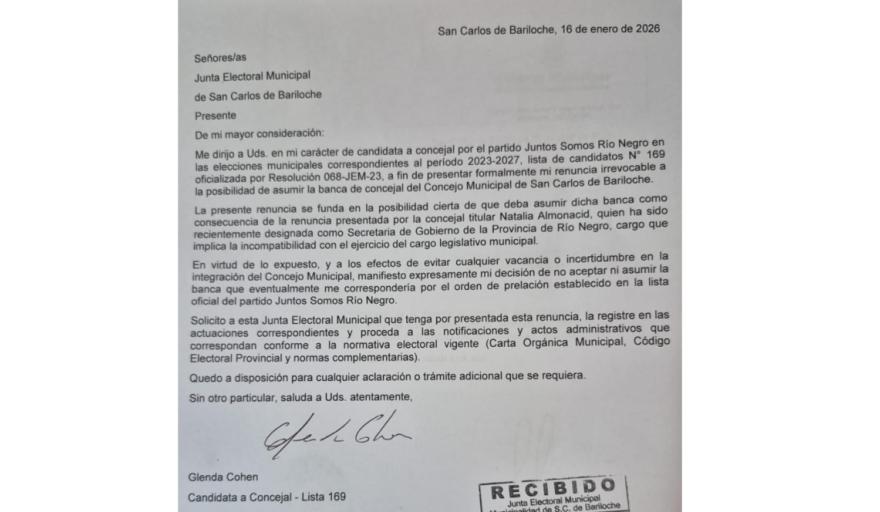 La renuncia, formalizada con sello de recibido por la Junta Electoral Municipal de Bariloche el 16 de enero de 2026, solicita que el organismo registre la presentación en las actuaciones correspondientes y proceda a las notificaciones y actos administrativos que correspondan conforme a la normativa electoral vigente, la Carta Orgánica Municipal, el Código Electoral Provincial y normas complementarias.