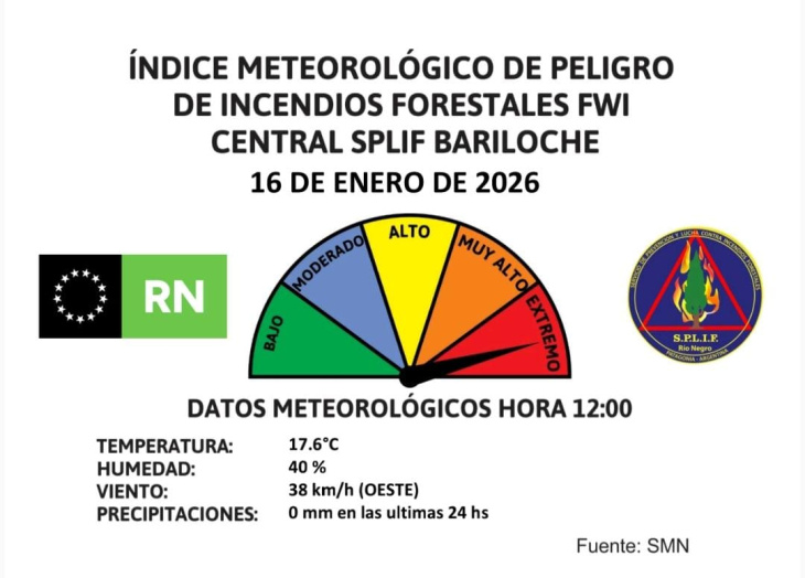 El Servicio Provincial de Manejo del Fuego (SPLIF) de Río Negro informó que el índice FWI (Fire Weather Index) para la Central Bariloche alcanzó este viernes 16 de enero un nivel de peligro "muy alto" de incendios forestales, según el reporte meteorológico de las 12 horas. Las condiciones registradas por el Servicio Meteorológico Nacional marcan una temperatura de 17,6°C, una humedad relativa del 40 por ciento, vientos del oeste de 38 kilómetros por hora y ausencia total de precipitaciones en las últimas 24 horas, una combinación que eleva significativamente el riesgo de propagación de incendios.