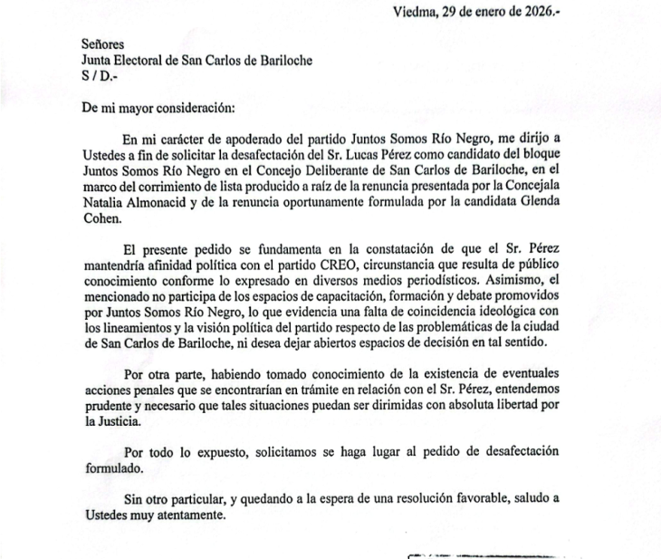 El pedido formal de desafectación ahora está en manos de la Junta Electoral, que deberá resolver si Pérez puede o no asumir la banca. Rodríguez, el apoderado que firmó la solicitud, cierra su carta con una frase que parece sacada de un manual de urbanidad institucional: "Sin otro particular, y quedando a la espera de una resolución favorable, saludo a Ustedes muy atentamente". Detrás de esa cortesía formal se esconde una batalla política que recién empieza, una disputa que mezcla lealtades partidarias, causas judiciales y la pregunta central sobre quién puede y quién no puede representar a la ciudadanía en el Concejo Municipal de Bariloche.