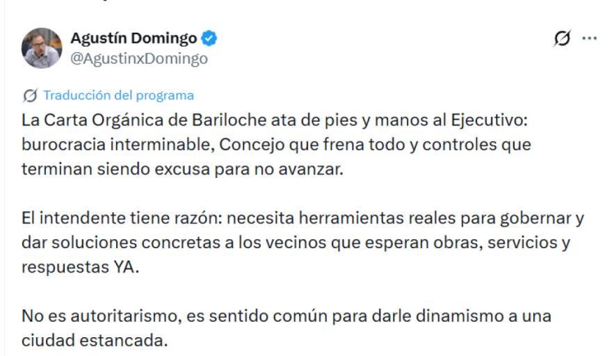 "La Carta Orgánica de Bariloche ata de pies y manos al Ejecutivo: burocracia interminable, Concejo que frena todo y controles que terminan siendo excusa para no avanzar. El intendente tiene razón: necesita herramientas reales para gobernar y dar soluciones concretas a los vecinos que esperan obras, servicios y respuestas YA", planteó Domingo en su cuenta de X, donde respaldó la crítica del jefe comunal al funcionamiento actual del sistema institucional barilochense.