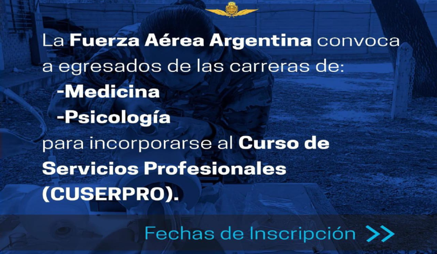 Las especialidades convocadas son médico, licenciado en Kinesiología y licenciado en Psicología, y quienes resulten seleccionados deberán incorporarse al Curso de Servicios Profesionales, conocido institucionalmente como CUSERPRO. Este curso representa la instancia de formación militar que habilita a los profesionales civiles para integrarse al escalafón de oficiales de la Fuerza Aérea, combinando su expertise técnico con las exigencias propias de la vida castrense.