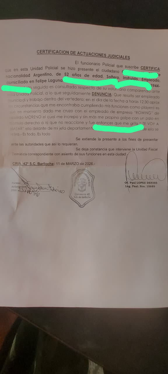 Según consta en la certificación de actuaciones judiciales labrada en la Comisaría 42 de San Carlos de Bariloche, el damnificado se presentó voluntariamente ante la unidad policial para radicar la denuncia. En su relato, indicó que en el momento del hecho se encontraba realizando sus tareas habituales cuando se cruzó con un empleado de Rowing de apellido Moreno, quien lo increpó y, sin mediar mayores palabras, le propinó un golpe con un palo en el brazo derecho. Acto seguido, según declaró la víctima, Moreno le gritó "te voy a matar" delante de su jefa de turno.