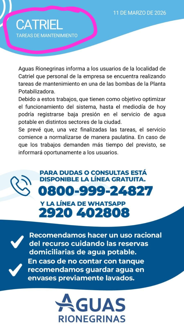 A la escasez se suma la indignación por lo que los vecinos describen como un doble estándar de la empresa: mientras piden racionamiento a los usuarios del barrio, en las calles cercanas —Crucero General Belgrano, Frey y 2 de Agosto— hay pérdidas visibles que nadie repara. Los reclamos formales que los vecinos elevaron a Aguas Rionegrinas fueron respondidos con mensajes automáticos de mantenimiento provenientes, según contaron, desde Catriel.