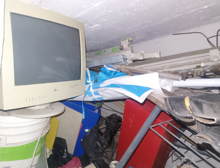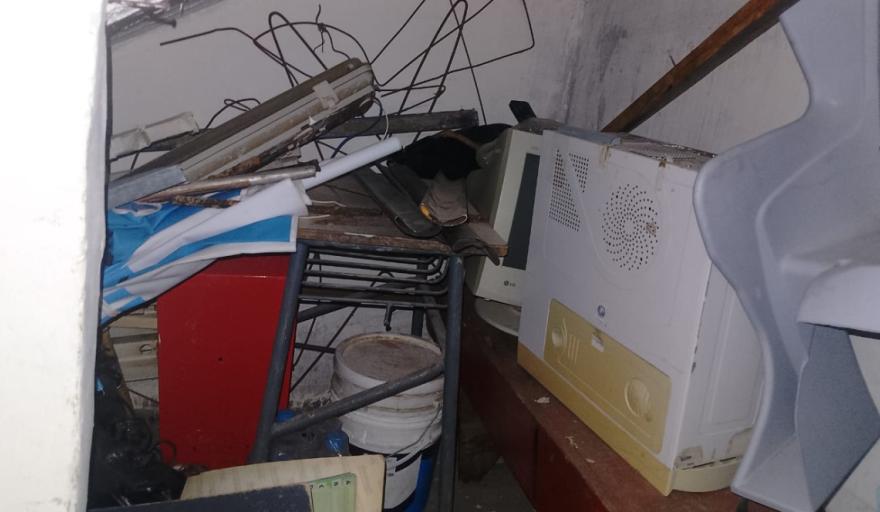 Cuando Nataly Mansilla Pérez y la nueva comisión de la junta vecinal del barrio Arrayanes pudieron finalmente entrar al lugar, lo que encontraron fue esto: botellas de agua apiladas hasta el techo, una silla de ruedas tirada en un pasillo, un monitor de computadora de los años noventa en medio de un depósito abarrotado, cables sueltos, herramientas oxidadas, muebles apilados sin orden y una bandera argentina arrugada entre la chatarra.
