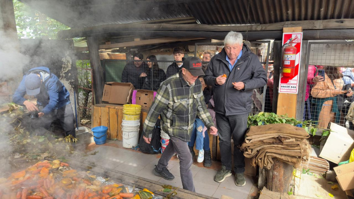 El momento central de la jornada fue el destape del curanto. Los organizadores comenzaron a remover la tierra con palas mientras el vapor escapaba en bocanadas y la multitud se apretujaba para registrar el instante con sus teléfonos. Debajo de las capas de hojas nativas y arpillera apareció la comida cocida a fuego lento durante horas: zapallo, papas, chorizos, longanizas, manzanas, zanahorias y otros ingredientes dispuestos sobre las piedras calientes que actuaron como horno natural.