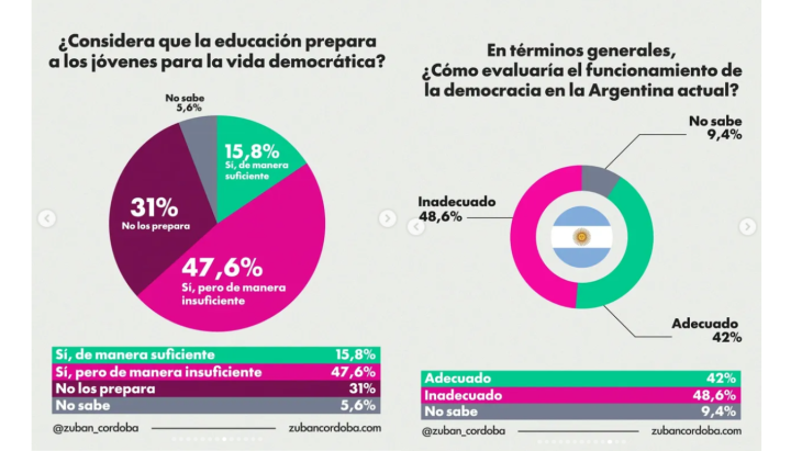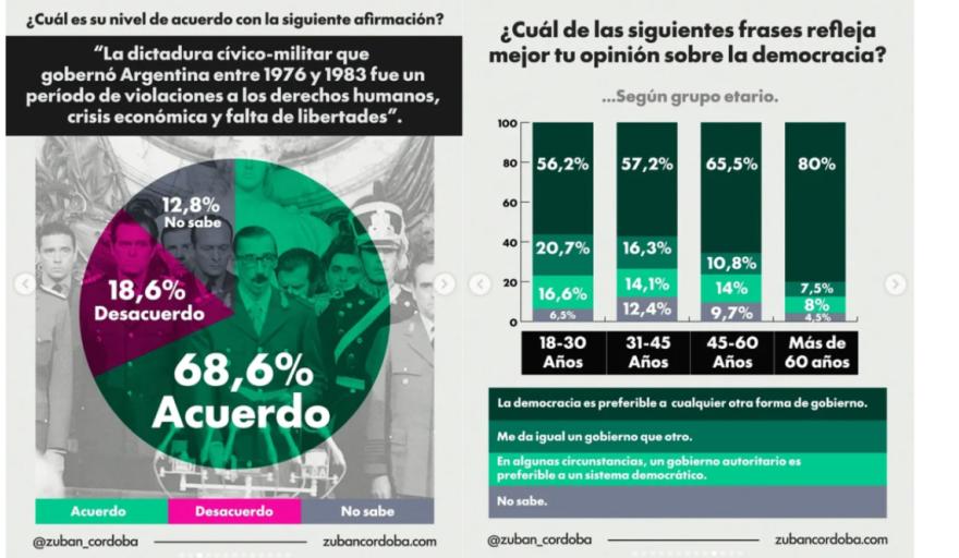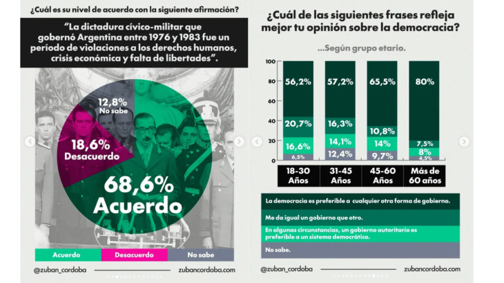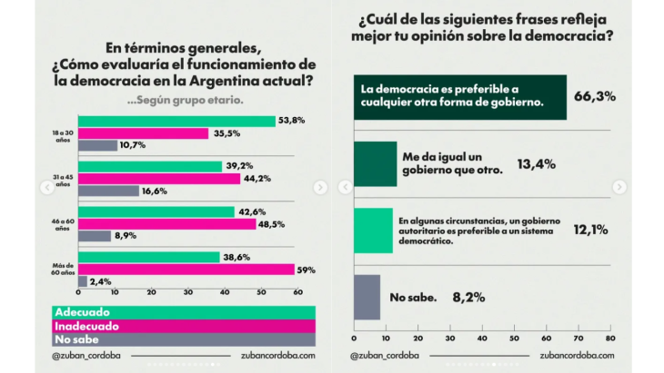 El problema no empieza ni termina en la memoria de la dictadura. Empieza antes, en algo más profundo: la relación que los argentinos tienen con la democracia misma. El 66,3% dice que la prefiere a cualquier otra forma de gobierno. Suena bien hasta que se mira el resto: un 12,1% considera que en algunas circunstancias un gobierno autoritario sería preferible, y un 13,4% declara que le da igual un gobierno que otro. Uno de cada cuatro argentinos, entonces, no tiene un compromiso firme con la democracia como sistema. Y ese uno de cada cuatro no es una abstracción: vota, consume información, forma opinión, cría hijos.