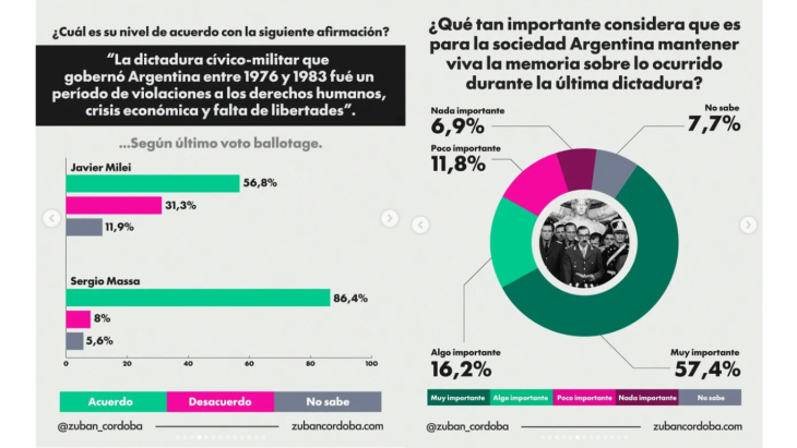 El 57,4% considera muy importante mantener viva la memoria sobre la última dictadura. Entre quienes votaron a Sergio Massa en el balotaje de 2023, ese número trepa al 90,6%. Entre quienes votaron a Javier Milei, cae al 61,2%, con un 33,1% que lo considera no importante. Son dos países dentro del mismo país, con dos relaciones distintas con el pasado y, por lo tanto, con dos visiones distintas del futuro. Convivir con esa fractura sin intentar reducirla no es neutralidad: es resignación.