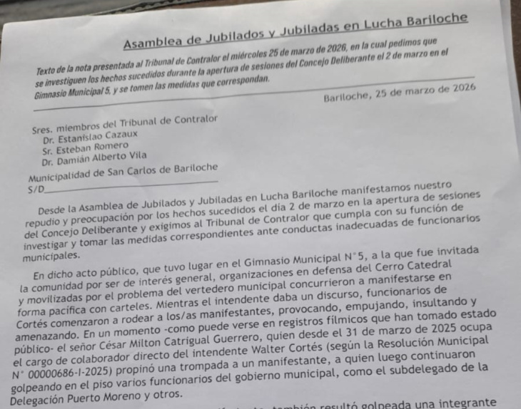La Asamblea de Jubilados y Jubiladas en Lucha Bariloche llevó al Tribunal de Contralor su repudio por los hechos del 2 de marzo, cuando la apertura de sesiones del Concejo Deliberante derivó en un episodio de violencia institucional que dejó al menos una integrante de la organización hospitalizada. En el escrito dirigido a los miembros del Tribunal, Estanislao Cazaux, Esteban Romero y Damián Alberto Vila, la asamblea exigió que el organismo cumpla su función de investigar las conductas y tomar las medidas correspondientes.