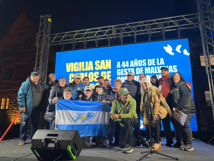 Alrededor de las 9 de la noche, cuando concejales, funcionarios y autoridades ya habían comenzado a llegar, la plaza reunía a unas 400 personas. Había gente joven, gente grande, familias de veteranos y combatientes de toda Río Negro. Frente al municipio, un escenario dispuesto para la ocasión recibió músicos y hacedores culturales locales que interpretaron obras que emocionaron hasta las lágrimas, con bailes, cantos y tangos que pusieron música a una noche cargada de memoria.
