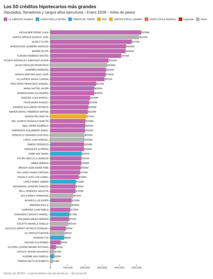 Hay una historia que se cuenta sola si uno sabe dónde mirar. Un gráfico publicado por el visualizador de datos Andrés Snitcofsky, basado en información de la Central de Deudores del Banco Central, ordenó los cincuenta créditos hipotecarios más grandes otorgados por el Banco Nación a diputados, senadores y funcionarios ejecutivos. La lista es larga, los montos son enormes, y Río Negro tiene tres nombres propios adentro.