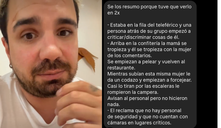 El episodio ocurrió en plena escalera, rodeado de familias, niños y personas mayores. Tapia y su familia se acercaron al personal de la confitería para pedir que se tomaran medidas e identificaran a la agresora mediante las cámaras de seguridad. La respuesta fue decepcionante: una empleada mostró predisposición, pero el mozo que intervino no hizo nada concreto y nadie de las autoridades del teleférico se acercó a tomar datos o a ofrecer seguimiento.