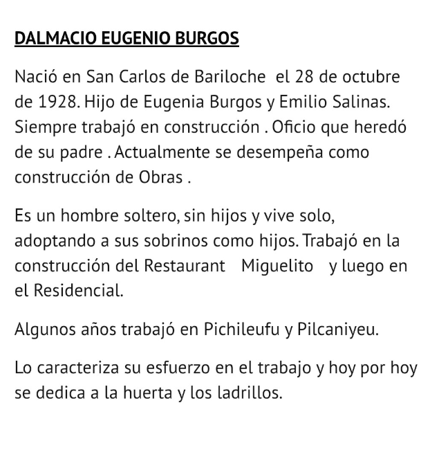 La urna llevaba el nombre de Dalmacio Eugenio Burgos, nacido en San Carlos de Bariloche el 28 de octubre de 1928, hijo de Eugenia Burgos y Emilio Salinas. Según la información que acompañaba el objeto, Burgos trabajó toda su vida en la construcción, oficio que heredó de su padre, y participó en obras como el Restaurant Miguelito y un residencial de la zona. También trabajó durante algunos años en Pichileufu y Pilcaniyeu. Era soltero, sin hijos, vivía solo y había adoptado a sus sobrinos como propios. Lo describían como un hombre esforzado, dedicado en sus últimos tiempos a la huerta y a hacer ladrillos.