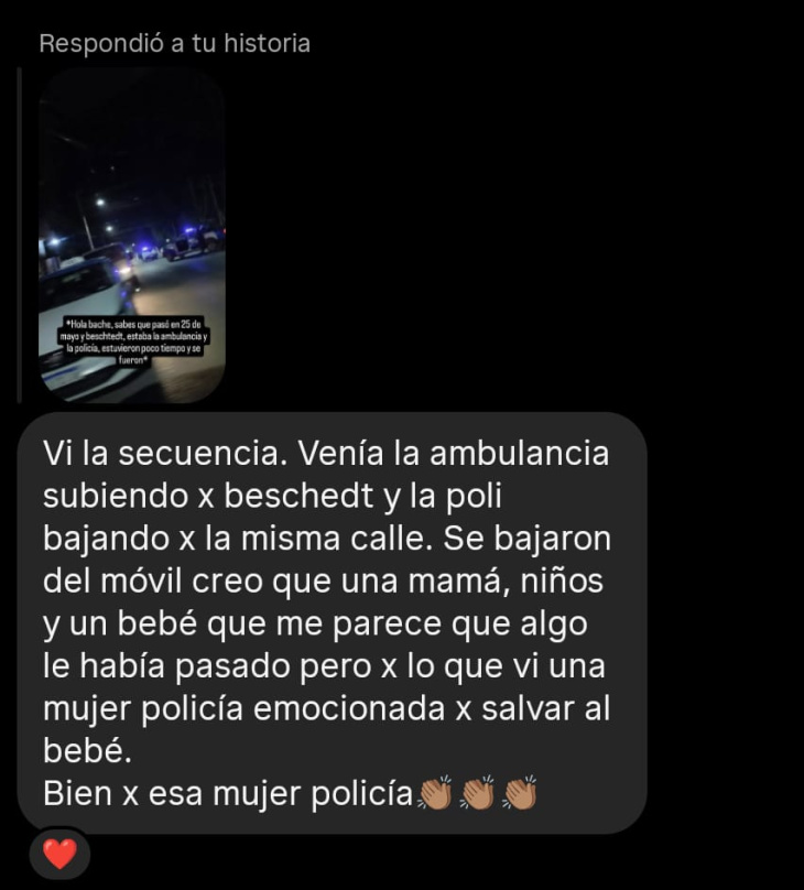En las redes, los vecinos que vieron pasar las sirenas ya lo intuían sin conocer los detalles. "Bien por esa mujer policía", escribió uno en respuesta a la historia de Bache3000. Otro, más escueto y más exacto: "Salvaron una bebé que se ahogaba. Vivo por ahí y justo vi todo."