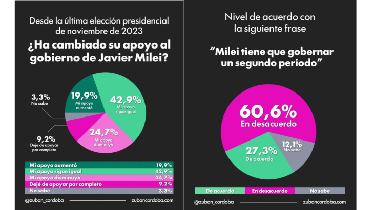 El mismo escenario se replica cuando se pregunta por un segundo mandato en términos directos: el 60,6% está en desacuerdo con que Milei deba gobernar un segundo período, frente al 27,3% que lo apoya.