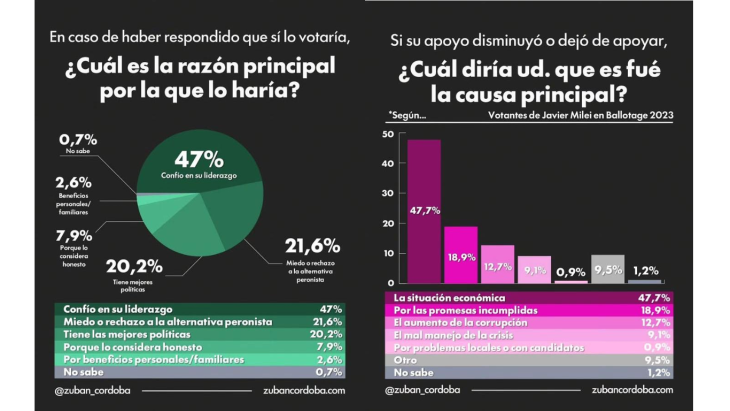 Entre los propios votantes del ballotage 2023 que reconocen haber reducido o abandonado su apoyo, la economía también lidera las explicaciones: el 47,7% cita la situación económica, el 18,9% las promesas incumplidas y el 12,7% el aumento de la corrupción. Los que mantienen su respaldo lo justifican principalmente por la buena gestión en crisis (39,6%) y la confianza en el liderazgo (29,2%).