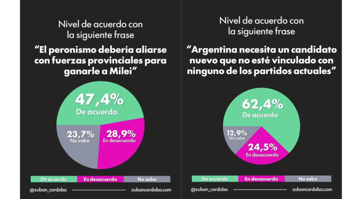 Por el lado opositor, el diagnóstico es contundente: el 60,3% de los encuestados considera que la oposición a Milei está desorganizada. Sin embargo, casi la mitad —el 48,2%— apoyaría una alianza entre varios partidos para competirle, y el 47,4% ve con buenos ojos que el peronismo se una a fuerzas provinciales con ese objetivo.