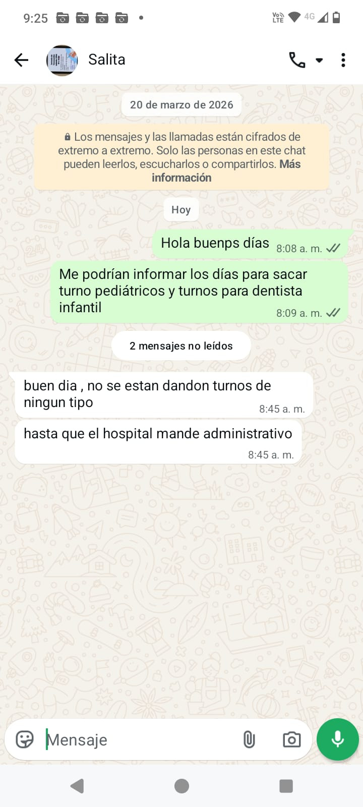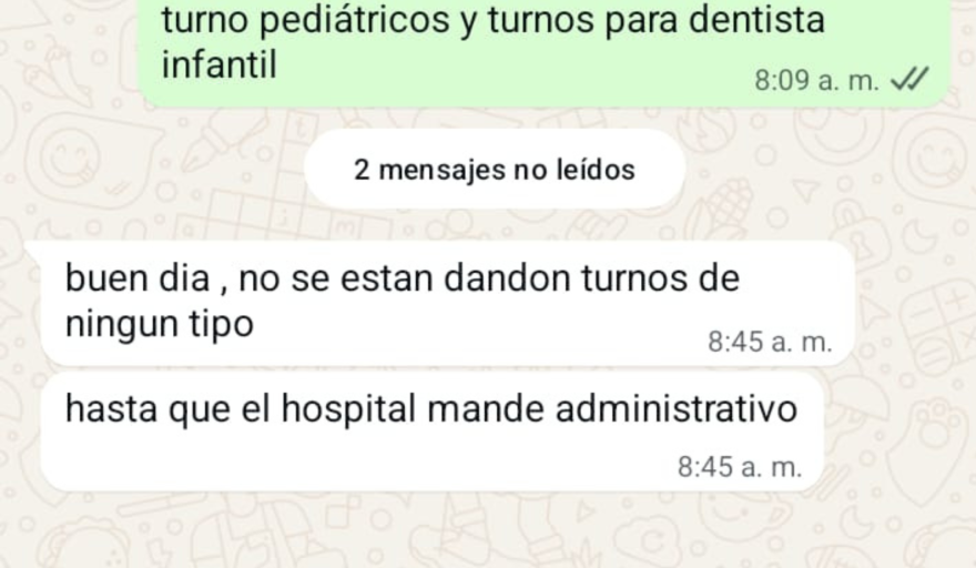 Un vecino del barrio El Frutillar se acercó hasta el Centro de Salud ubicado en Cacique Chocori 4065, tras intentar sacar un turno pediátrico y otro odontológico para sus hijos por WhatsApp. "Nos vemos con la desilusión de que no hay administrativos para los turnos pediátricos ni odontológicos para los chicos y la gente de acá del barrio", explicó el hombre, visiblemente molesto pero sereno. Ante la consulta por los días para sacar turno pediátrico y odontológico infantil, la respuesta fue directa: "buen dia, no se estan dando turnos de ningun tipo hasta que el hospital mande administrativo".