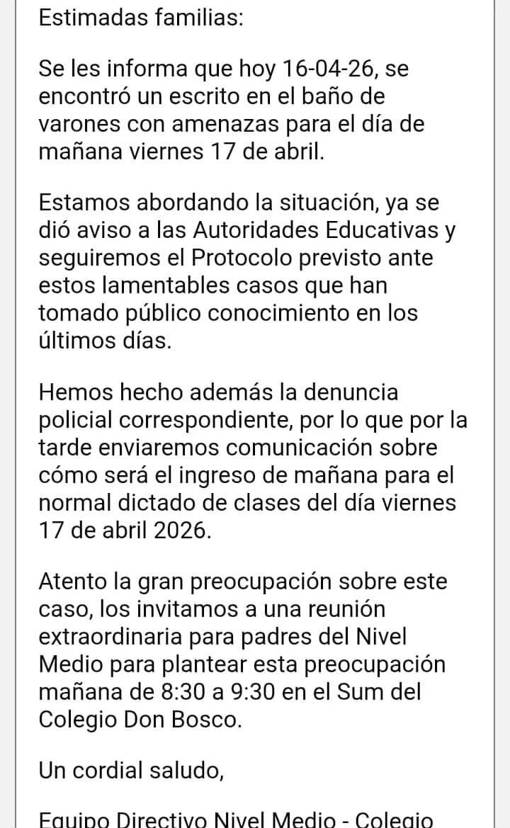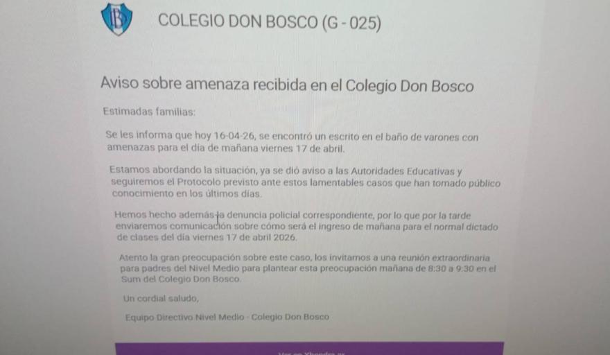 "Hoy 16-04-26 se encontró un escrito en el baño de varones con amenazas para el día de mañana viernes 17 de abril", informó el Equipo Directivo del Nivel Medio en el aviso difundido por la plataforma Xhendra. La conducción del colegio indicó que ya se notificó a las Autoridades Educativas y que se aplicará el protocolo establecido para estos casos, que en los últimos días tomaron estado público en otras instituciones de la región.