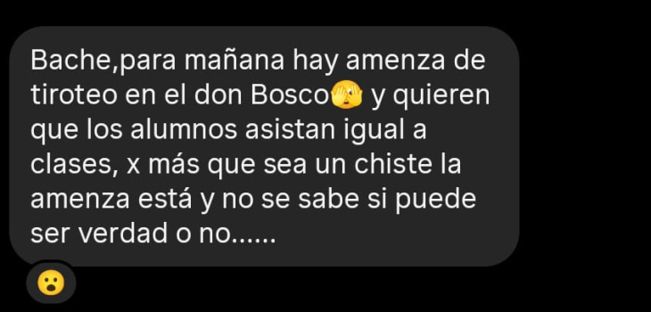 La primera alerta llegó a través de un seguidor de Bache3000, que advirtió sobre rumores que circulaban entre la comunidad educativa respecto a una amenaza de tiroteo. Poco después, el propio establecimiento confirmó la situación mediante un comunicado oficial enviado a las familias del Nivel Medio.