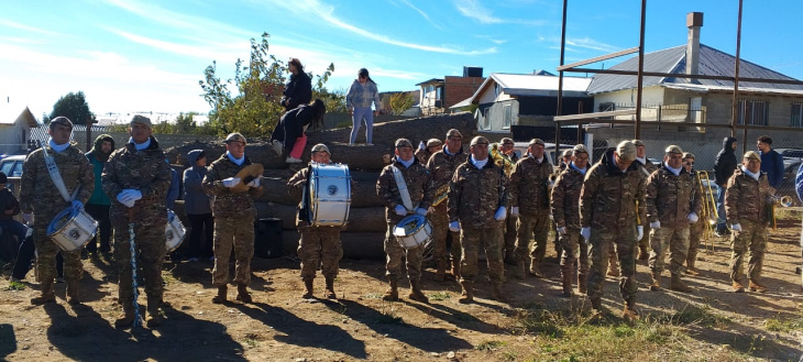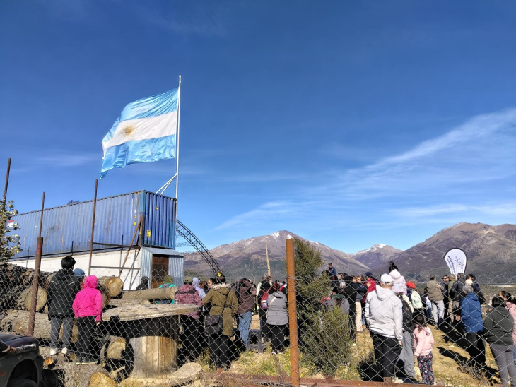 Estudiantes, trabajadores, docentes, empresarios, veteranos de Malvinas y vecinos del barrio se reunieron bajo el sol otoñal mientras la Banda Militar de Montaña Juan Domingo Perón ejecutaba el himno nacional. El escenario, todavía a medio construir —contenedores apilados, estructuras metálicas, troncos apilados en el piso— no impidió que el momento tuviera el peso de algo fundacional.