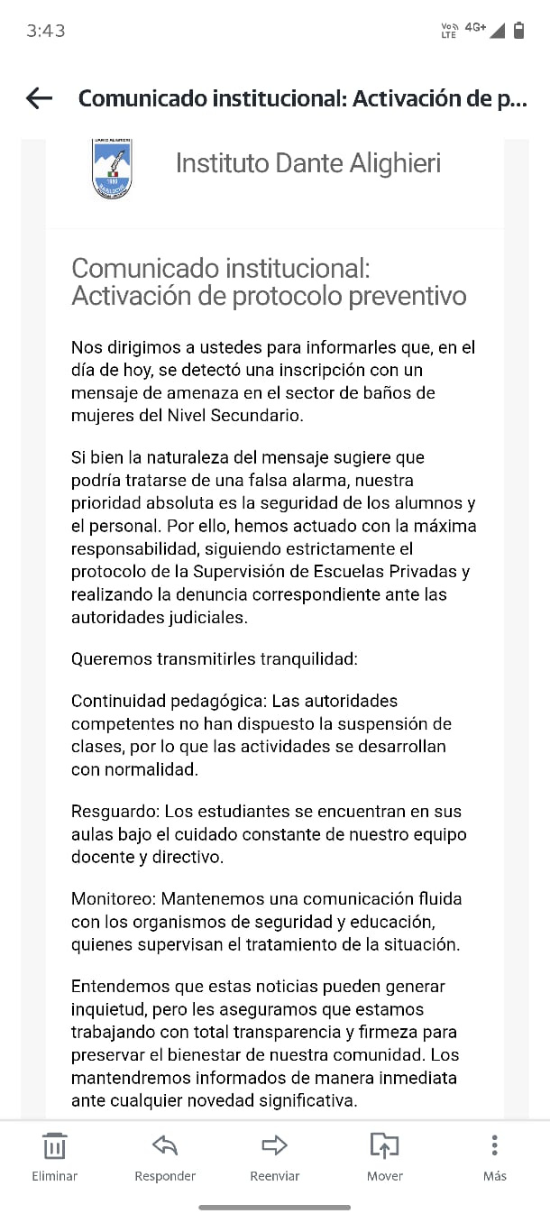 En el caso del Dante Alighieri, la amenaza apareció escrita en el sector de baños de mujeres del nivel secundario. La dirección del establecimiento informó a las familias mediante un comunicado institucional que, si bien la naturaleza del mensaje hacía pensar en una posible falsa alarma, la prioridad absoluta era la seguridad del alumnado y el personal. En consecuencia, se activó el protocolo de la Supervisión de Escuelas Privadas y se realizó la denuncia correspondiente ante las autoridades judiciales. Personal policial se hizo presente en el establecimiento a alrededor de las 10 de la mañana.